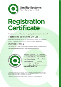 Fastening Solutions, leading supplier of threaded brass inserts for plastics and captive fasteners, are pleased to announce that they have been ISO 9001:2015 certified again this year.